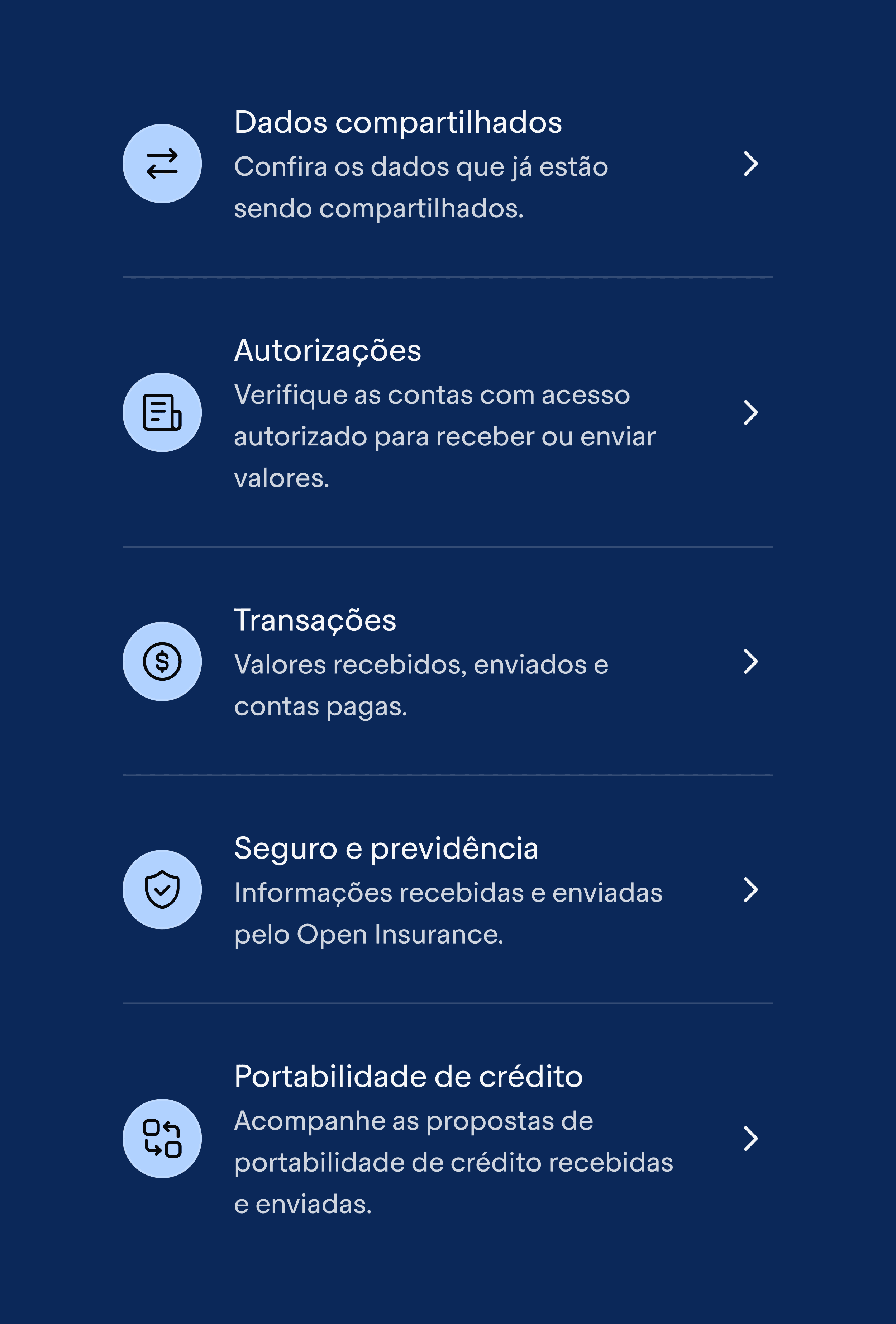 The Open Finance home needed to include a clear and structured set of mandatory sections: Shared Data, Authorizations, Transactions, and Credit Portability. These categories ensure compliance while giving users full visibility over what is being shared, which accounts are authorized, the financial movements involved, and any credit portability requests in progress. Each item plays a critical role in reinforcing transparency, control, and traceability within the ecosystem.